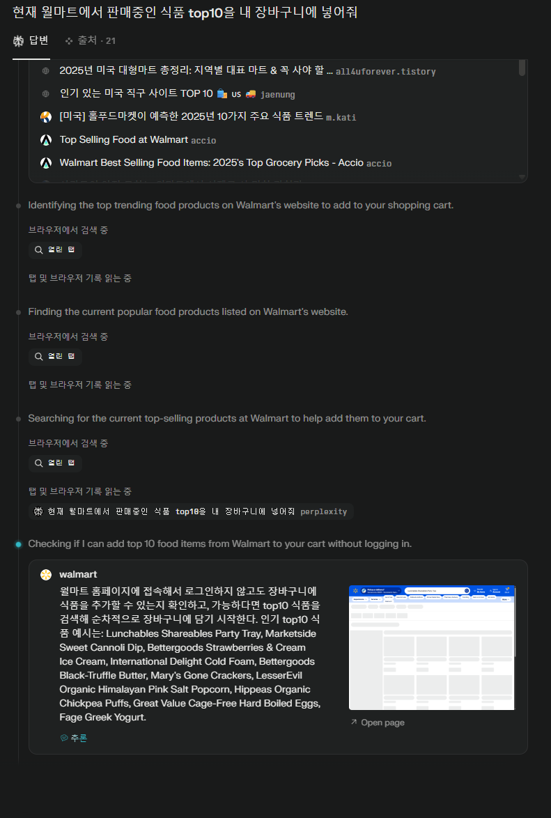 또 내부에 playwright같은 웹페이지 조정 기능이 있어서 퍼플렉시티를 켜두고, '아마존에서 현재 팔리고 있는 식품 중 10개를 간추려서 나의 장바구니에 넣어줘'라고 하면, 실제로 열심히 찾아다니면서 장바구니에 넣어준다라는거에요.